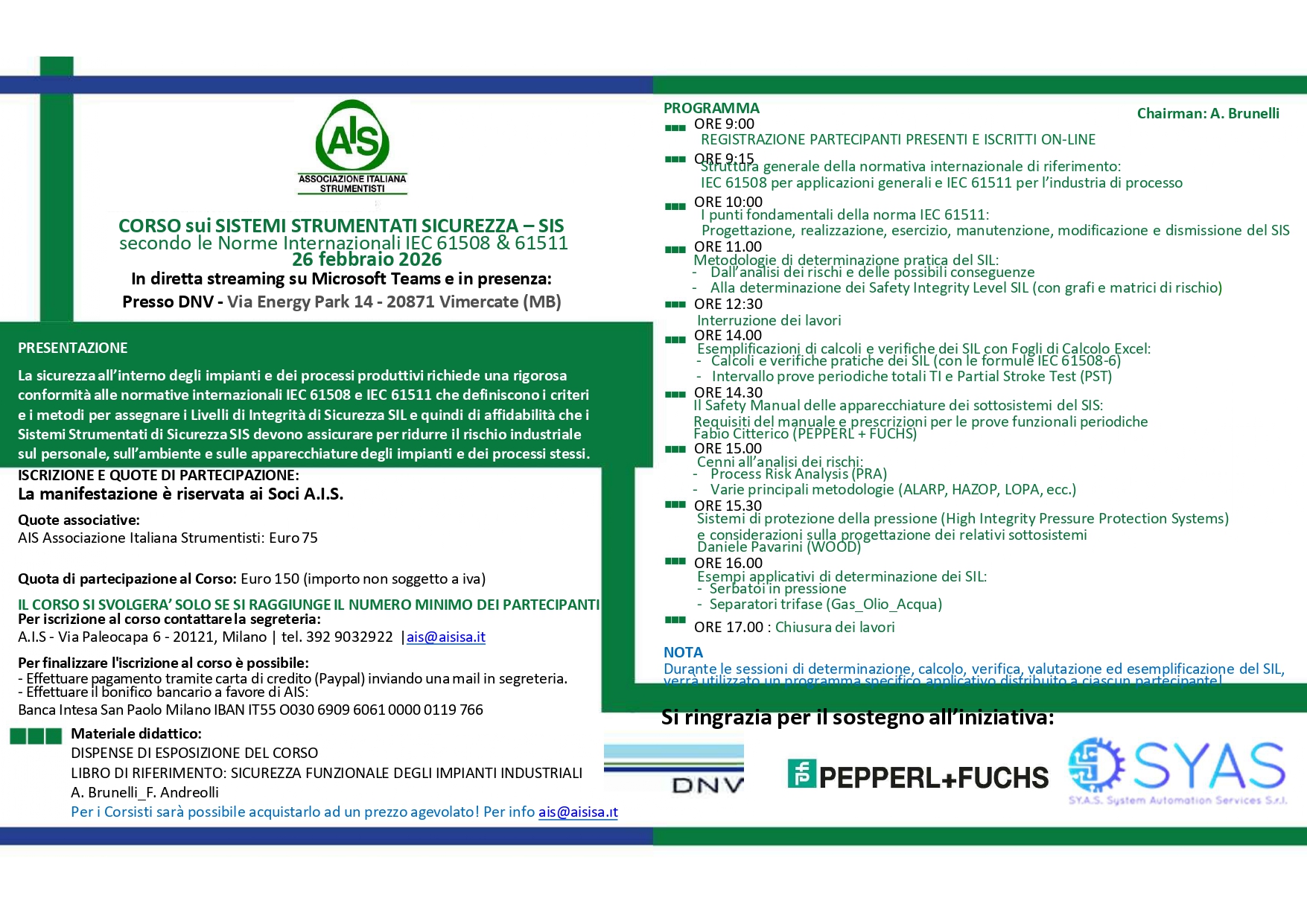 CORSO sui SISTEMI STRUMENTATI SICUREZZA (SIS) 26 febbraio 2026